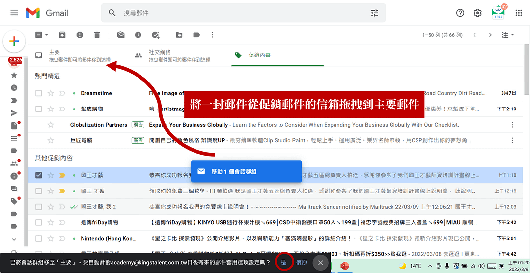 如果這封郵件是在您的促銷内容的信箱中收到的,但您後續想要 ''國王才藝''提醒說明會開始前的的郵件發到您的主要信箱,就只需將此封郵件從促銷内容的信箱拖拽到主要信箱就行囉~ 這樣才不會錯過我們的通知郵件。