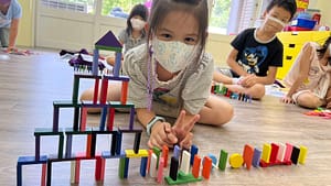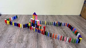 這是我們課程的一大特色!每堂課的最後都會安排成果展示時間,老師會協助拍攝骨牌倒下的瞬間影片,並提供給機構分享給家長,這也是家長最有感的部分。